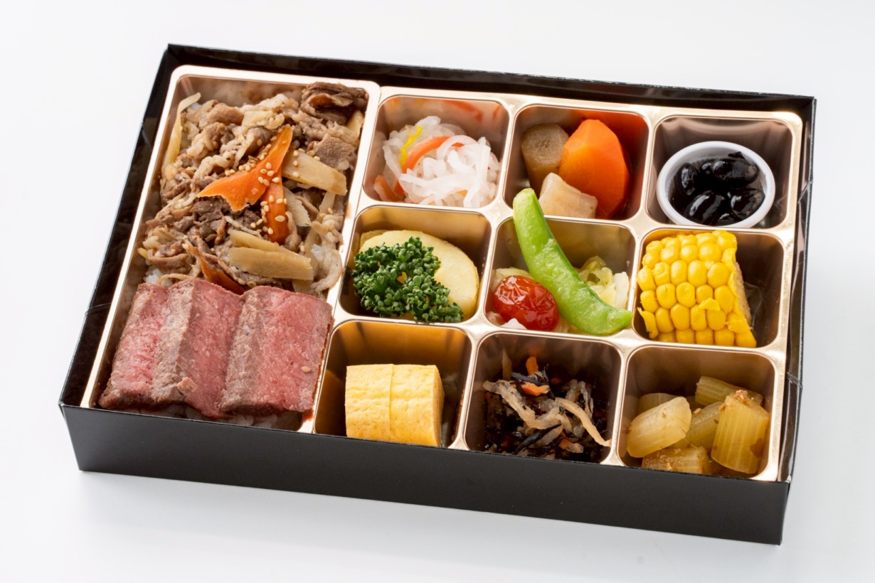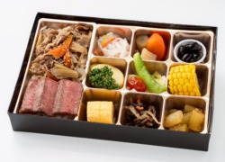 黒毛和牛ごぼう(50g)重/牛ステーキ(50g)/香り爽やか大根なます/煮〆(ごぼう・人参・柚子こんにゃく)/丹波ぶどう豆ふっくら蜜煮(猪口)/北海道十勝産皮つきじゃがいも/蒸し野菜(キャベツ・とうもろこし)/枝豆・トマト/玉子焼き/味染みひじき煮/季節の青菜お浸し