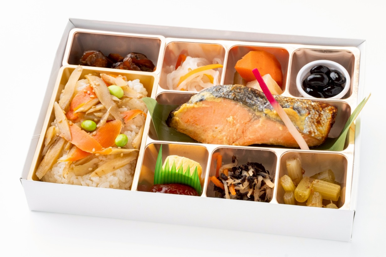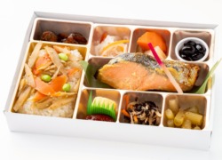 骨抜き銀さけ西京焼き(60g)/出汁ご飯(季節の根菜)/香り爽やか大根なます/煮〆(ごぼう・人参・柚子こんにゃく)/丹波ぶどう豆ふっくら蜜煮(猪口)/玉子焼き/味染みひじき煮/季節の青菜お浸し/香の物