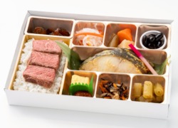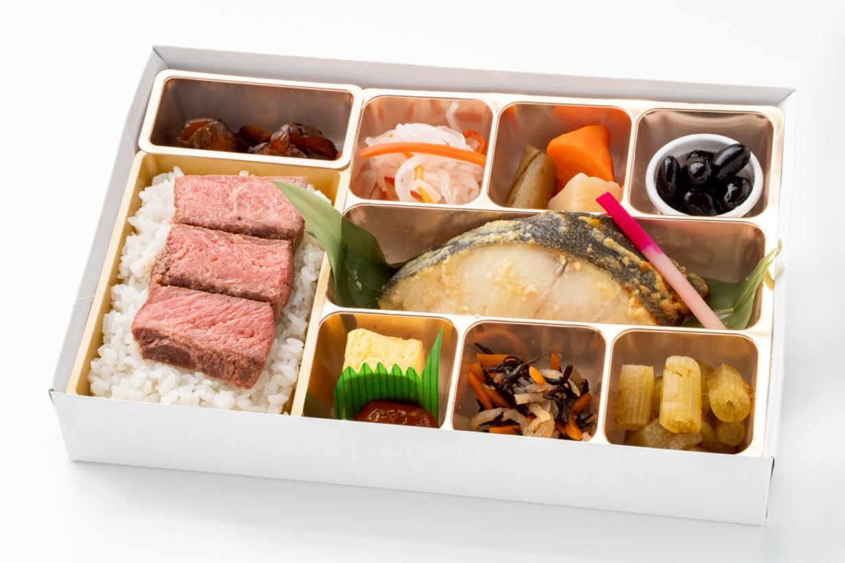 骨抜き銀だら西京焼き(60g)/牛ステーキ(50g)ご飯/香り爽やか大根なます/煮〆(ごぼう・人参・柚子こんにゃく)/丹波ぶどう豆ふっくら蜜煮(猪口)/玉子焼き/味染みひじき煮/季節の青菜お浸し/香の物