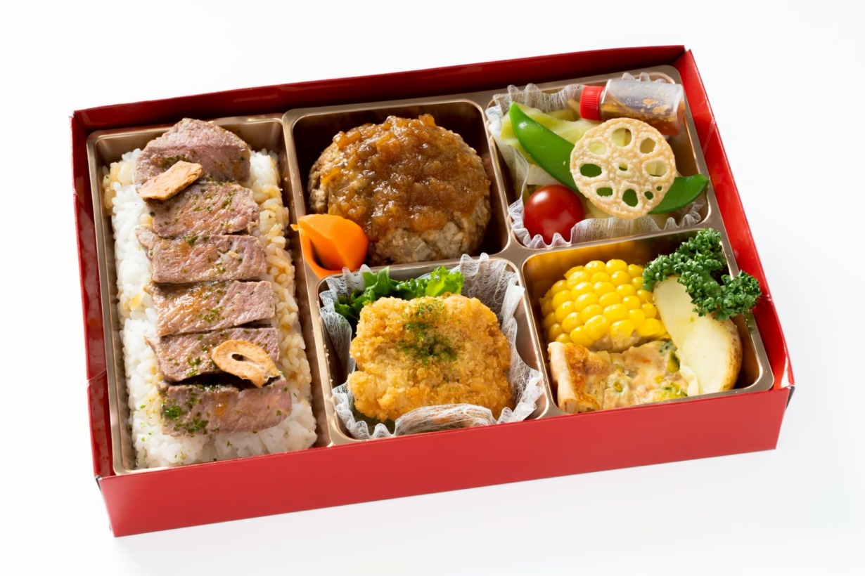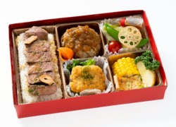 黒毛和牛ハンバーグ(130g)すりおろし玉葱醤油ソース/牛ステーキ(100g)重/ひとくちチキンカツ(4切)パセリ/蒸し野菜サラダ(キャベツ・枝豆・トマト・チップス)胡麻醤油ドレッシング/そうざい(キッシュ・とうもろこし・じゃがいも・人参)
