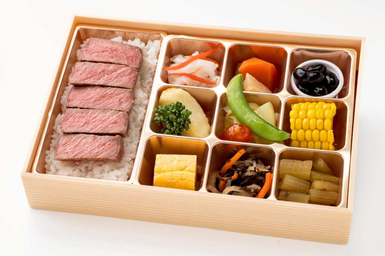 冷めても柔らかい牛ステーキ重を彩り良く盛り付けました。