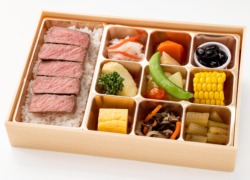 牛ステーキ(100g)重/香り爽やか大根なます/煮〆(ごぼう・人参・柚子こんにゃく)/丹波ぶどう豆ふっくら蜜煮(猪口)/北海道十勝産皮つきじゃがいも/蒸し野菜(キャベツ・とうもろこし)/枝豆・トマト/玉子焼き/味染みひじき煮/季節の青菜お浸し