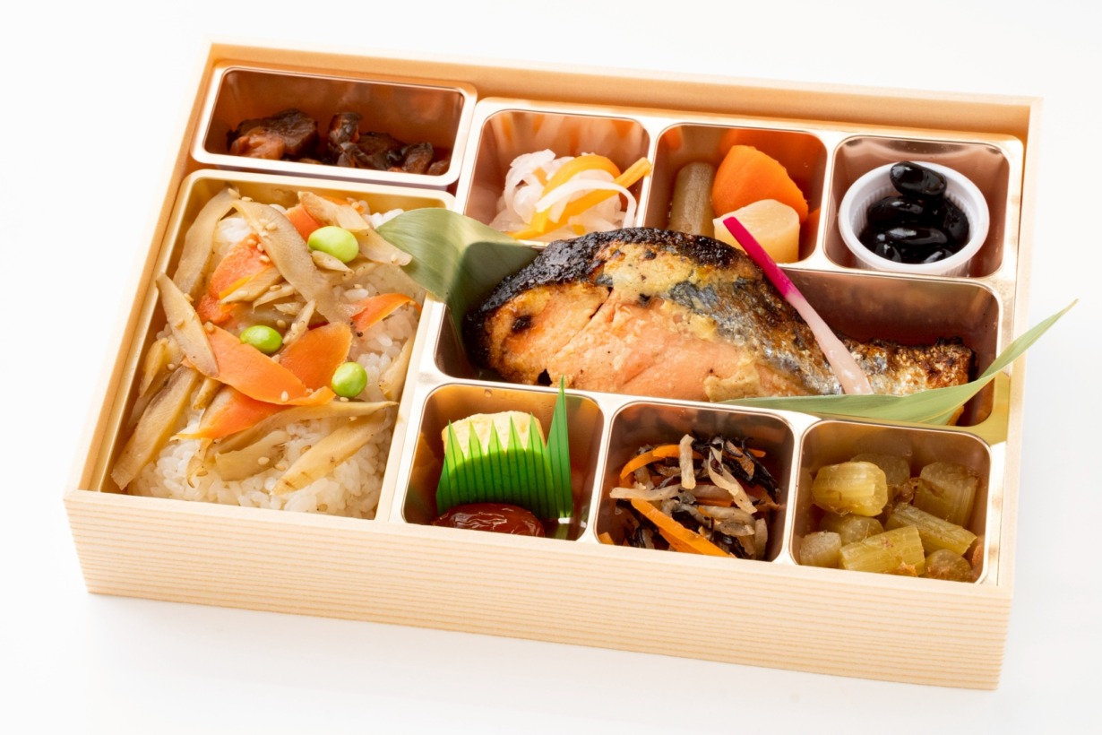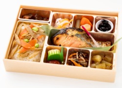 骨抜き銀さけ西京焼き(60g)/出汁ご飯(季節の根菜)/香り爽やか大根なます/煮〆(ごぼう・人参・柚子こんにゃく)/丹波ぶどう豆ふっくら蜜煮(猪口)/玉子焼き/味染みひじき煮/季節の青菜お浸し/香の物