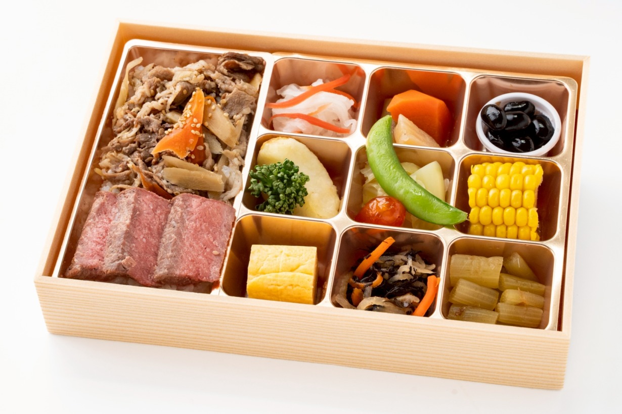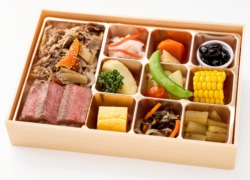 黒毛和牛ごぼう(50g)重/牛ステーキ(50g)/香り爽やか大根なます/煮〆(ごぼう・人参・柚子こんにゃく)/丹波ぶどう豆ふっくら蜜煮(猪口)/北海道十勝産皮つきじゃがいも/蒸し野菜(キャベツ・とうもろこし)/枝豆・トマト/玉子焼き/味染みひじき煮/季節の青菜お浸し