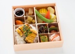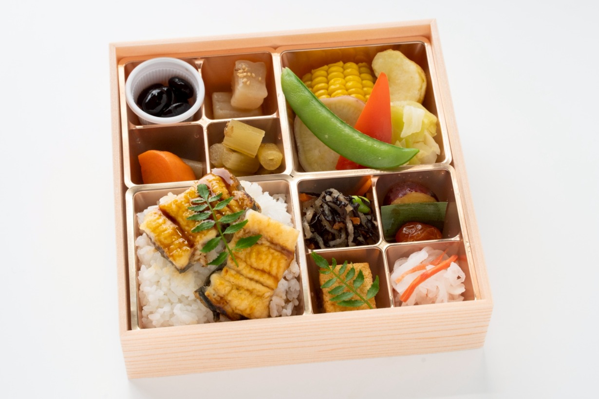 蒸し野菜(キャベツ・とうもろこし・北海道十勝産皮付きじゃがいも・スナップエンドウ)/うなぎ蒲焼き(2切)/ご飯/丹波産ぶどう豆蜜煮(猪口)/柚子こんにゃく/煮〆(ごぼう・人参)/季節の青菜お浸し/味染みひじき煮/さつまいも甘露煮・トマトワイン漬け/だしの旨味がたっぷり染み込んだがんも/香り爽やか大根なます