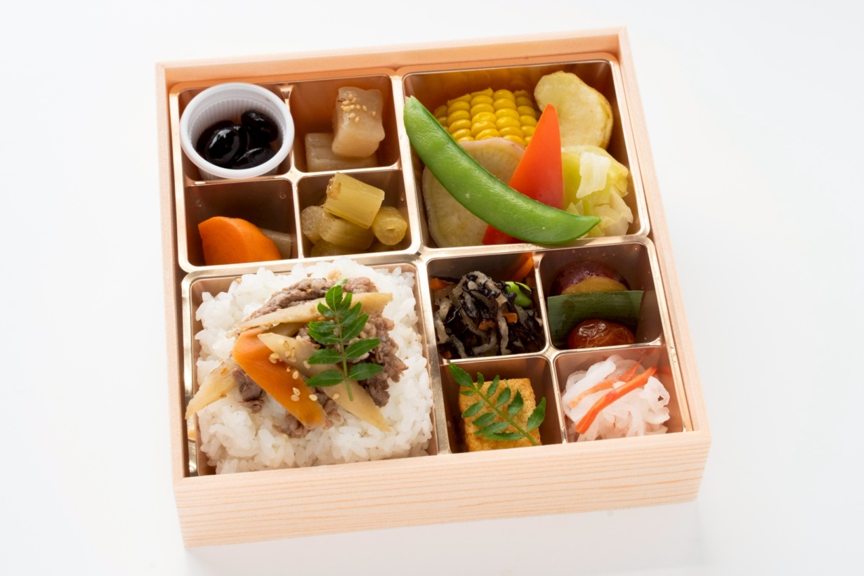 蒸し野菜(キャベツ・とうもろこし・北海道十勝産皮付きじゃがいも・スナップエンドウ)/黒毛和牛の牛ごぼう/ご飯/丹波産ぶどう豆蜜煮(猪口)/柚子こんにゃく/煮〆(ごぼう・人参)/季節の青菜お浸し/味染みひじき煮/さつまいも甘露煮・トマトワイン漬け/だしの旨味がたっぷり染み込んだがんも/香り爽やか大根なます
